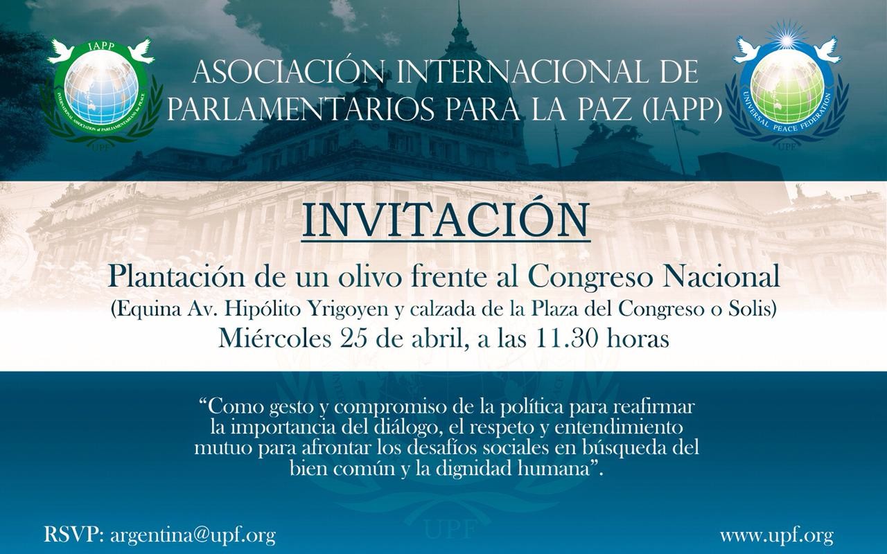Invitamos a Ud. a participar de la plantación de un olivo, el miércoles 25 de abril, a las 11.30 horas, frente al Congreso Nacional (equina Av. Hipólito Yrigoyen y calzada de la Plaza del Congreso o Solis). Como gesto y compromiso de la política, reafirmando la importancia del diálogo, el respeto y entendimiento mutuo para afrontar los desafíos sociales en búsqueda del bien común y la dignidad humana.