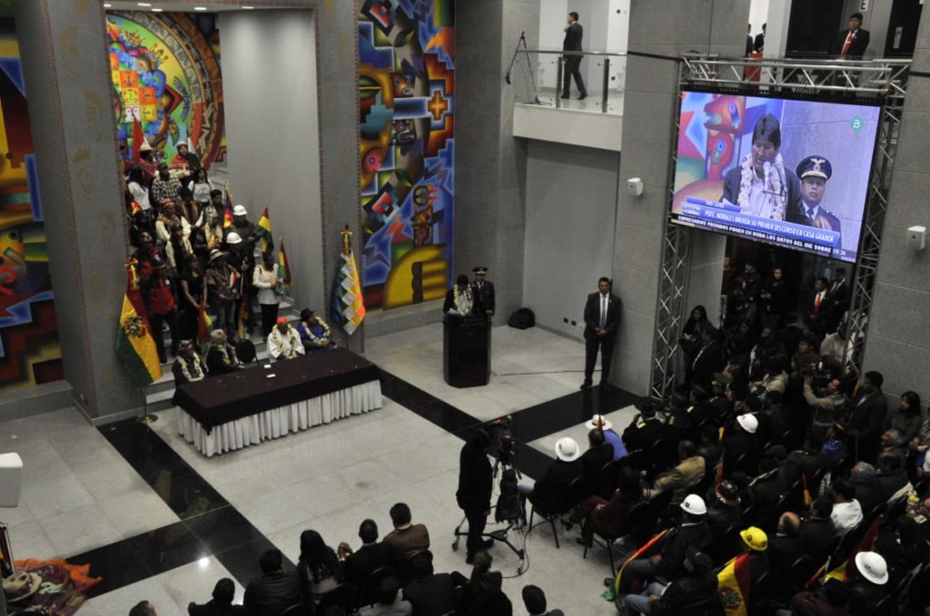 Ante un auditorio repleto, Morales —que lució el mismo traje que utilizó el 22 de enero de 2006, cuando juró a la presidencia del país— justificó la construcción del nuevo edificio, cuyo objetivo es “acabar con el Estado inquilino” y recuperar la identidad de los pueblos ancestrales de Bolivia, de la cual carecía el Palacio Quemado.