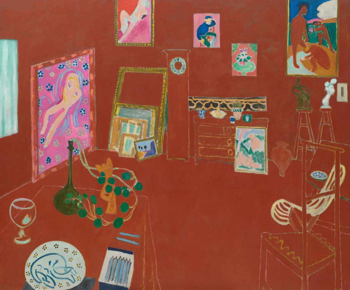 Matisse’s The Red Studio depicts the artist’s work environment in the town of Issy-les-Moulineaux. The Red Studio was painted as part of a sequence of works requested by Sergei Shchukin, Matisse’s most loyal and courageous early patron. Shchukin eagerly purchased the painting’s predecessor, The Pink Studio, but declined to acquire The Red Studio. The painting remained in Matisse’s possession for 16 years, during which time it traveled to the Second Post-Impressionist Exhibition in London in 1912 and to New York, Chicago, and Boston for the 1913 Armory Show.
