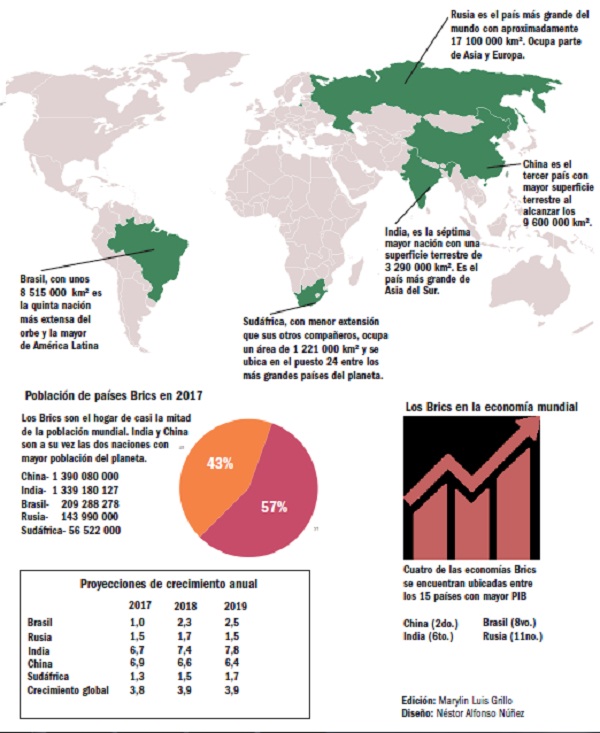 Son las mayores cinco economías emergentes del orbe, las que, en los momentos más oscuros de la última crisis mundial, le hicieron cara a la baja financiera con crecimientos impensables para muchos. En 2008 nacían los Brics, y par de años después incrementaban una letra más al unírseles Sudáfrica, como vanguardia africana.