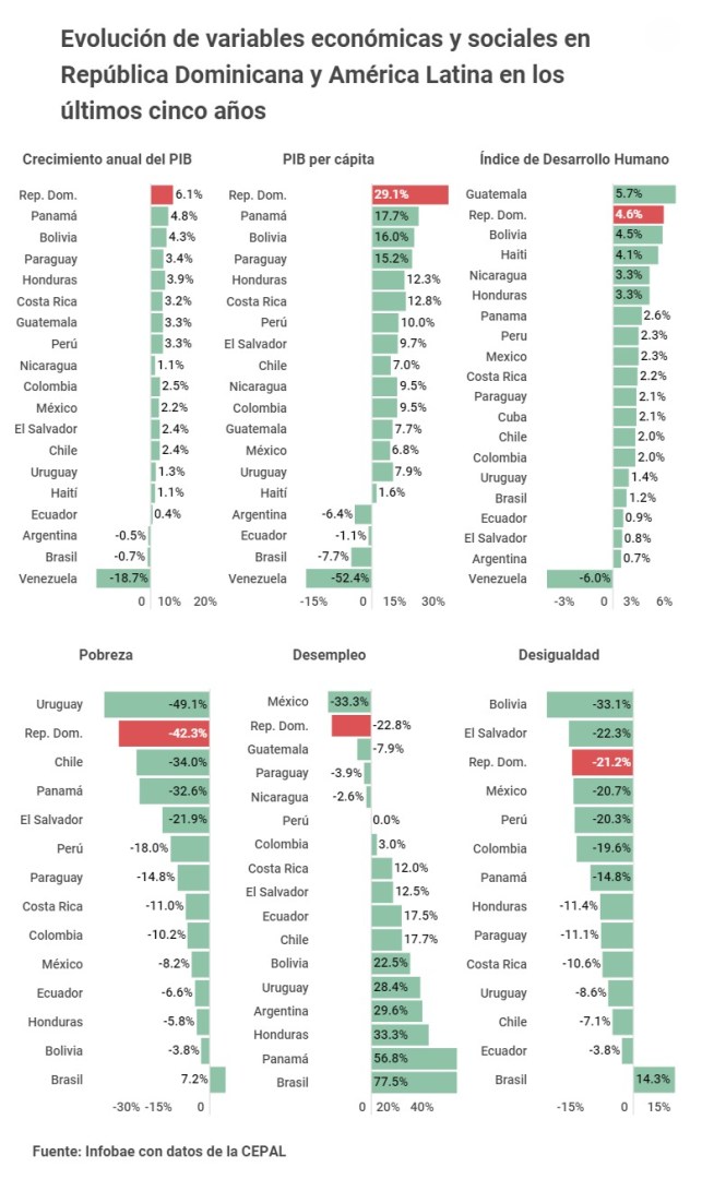 Pero lo notable es el progreso que viene experimentando en este tiempo, que le ha permitido acercarse a naciones que antes estaban muy lejos. El PIB por habitante de República Dominicana creció 29,1% en los últimos cinco años. Nuevamente, el que más se le acercó fue Panamá, con 17,7 por ciento.