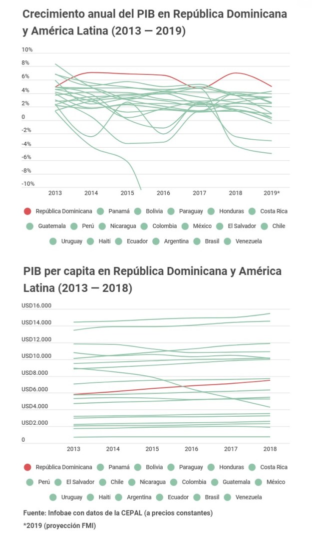 Entre 2014 y 2018, último año con cifras oficiales, República Dominicana creció a una tasa media de 6,5% anual, más que cualquier otro país latinoamericano. El que más se le acercó es Panamá, con una expansión de 5 por ciento.