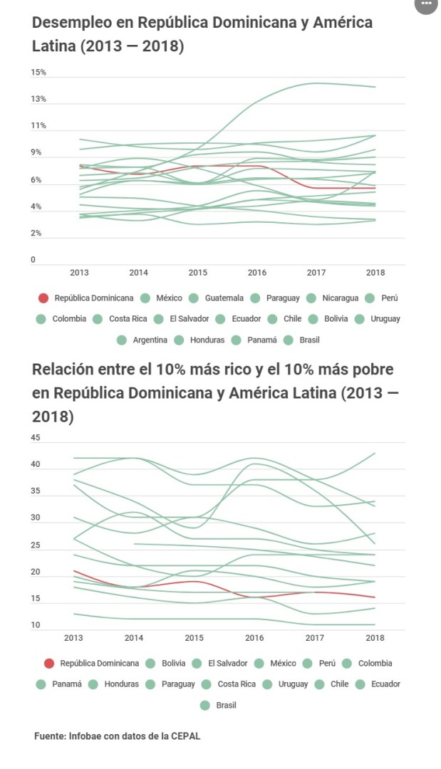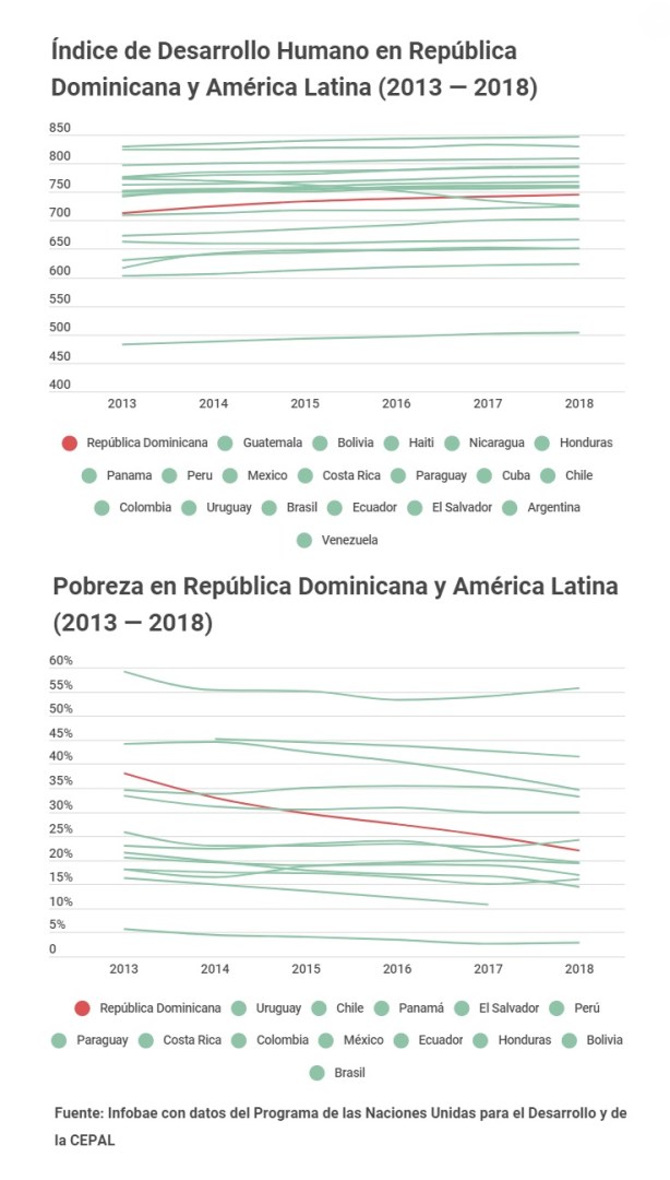 Lo más relevante del caso dominicano es que el crecimiento económico estuvo acompañado de una reducción de la pobreza y de la desigualdad. Entre 2013 y 2018, la proporción de pobres en el país se contrajo 42,3%, de 38% a 22% de la población. Únicamente Uruguay la redujo más (49,1 por ciento).